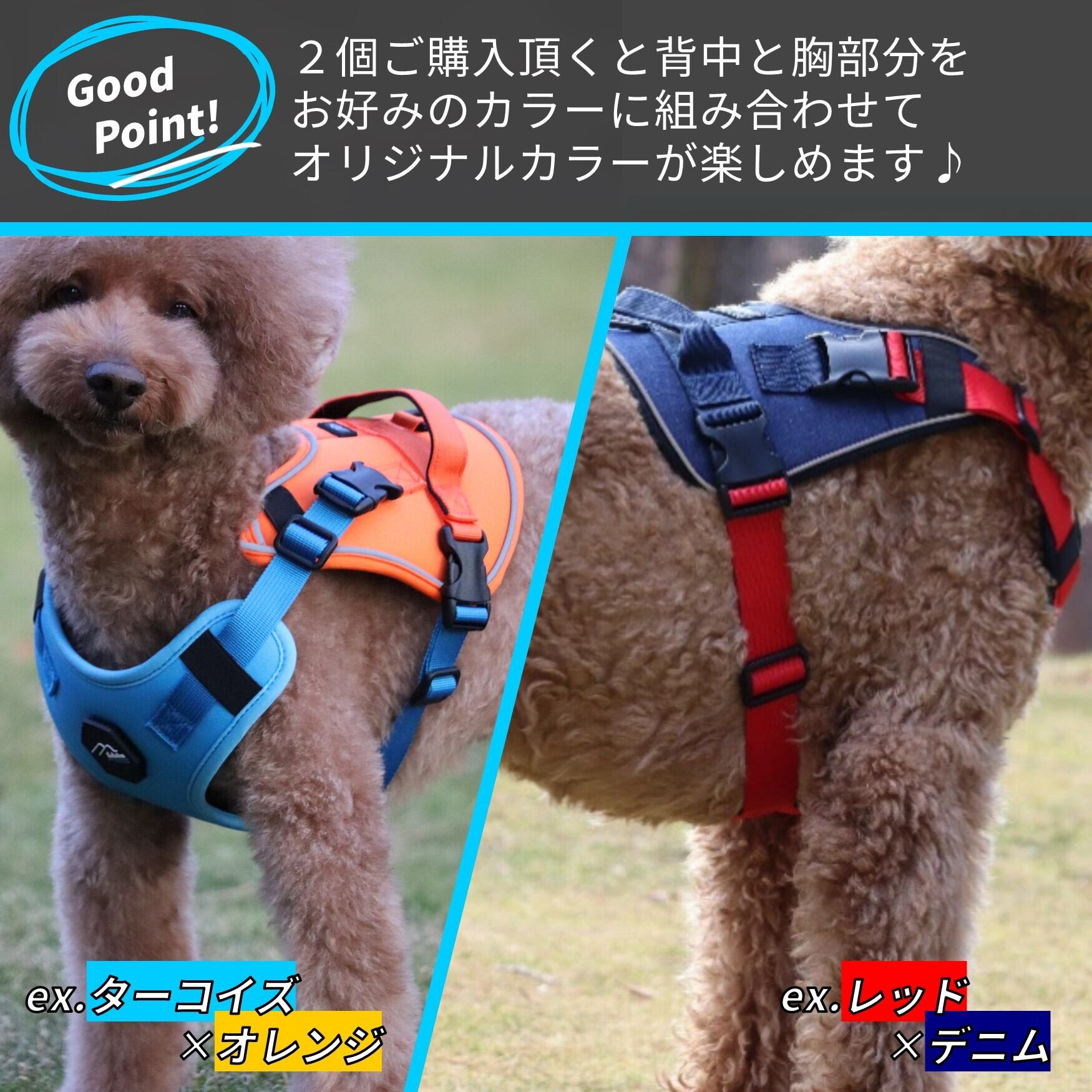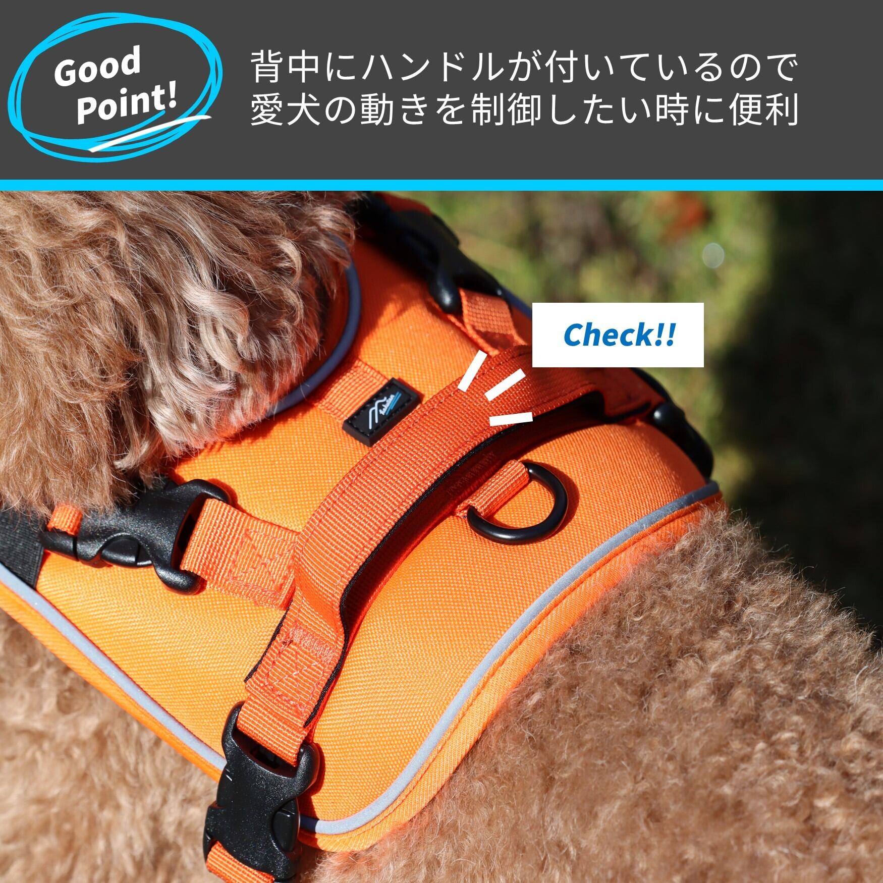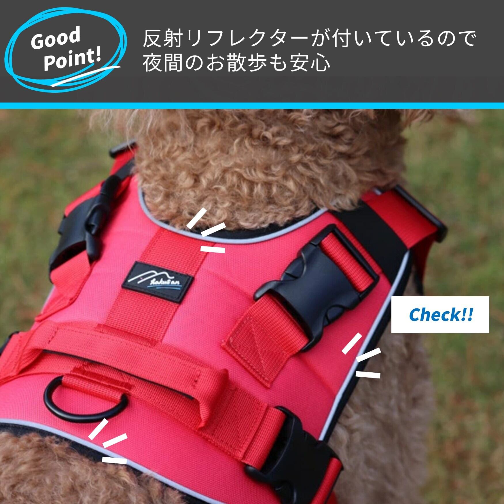 大きなパッドが愛犬の体全体をしっかり優しく包み込むハーネス。